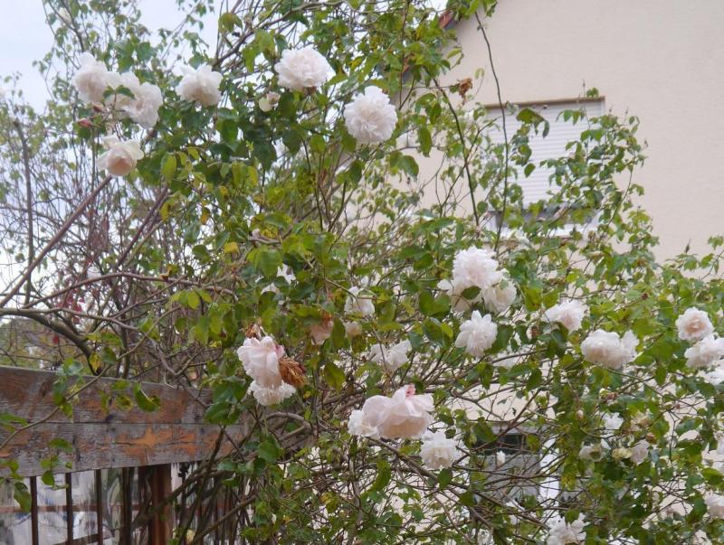 Meine Mme Alfred Carrière, eine meiner größten Rosen, die die ganze Frontwand des Carports für sich beanspruchte, blüht auch noch wunderbar:
