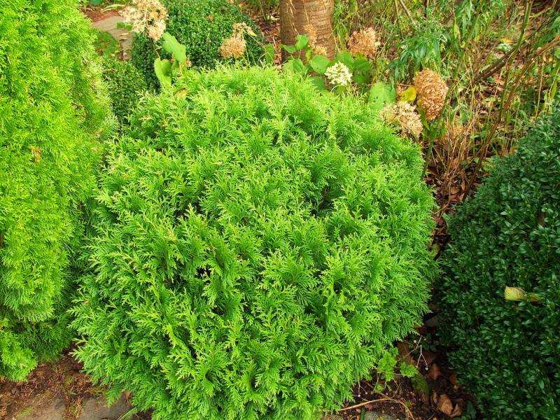 Ich glaube,ich habe für Kugelformen schon ein Beispiel im eigenen Garten gefunden. In einem Gartenteil der noch nicht vom Buchsbaumpilz befallen ist und vor allem gründominant ist,habe ich diese runden Zwergthujas stehen.