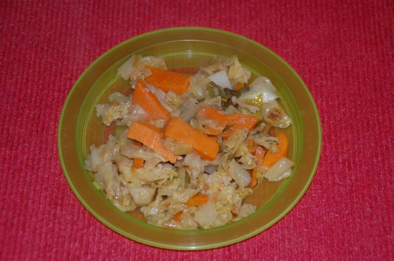 Heute gab es Wirsingkohlpfanne (Süßkartoffel, Wirsing, Porree, Lauchzwiebel, Möhre, Knoblauch, Kümmel, Salz, Öl).