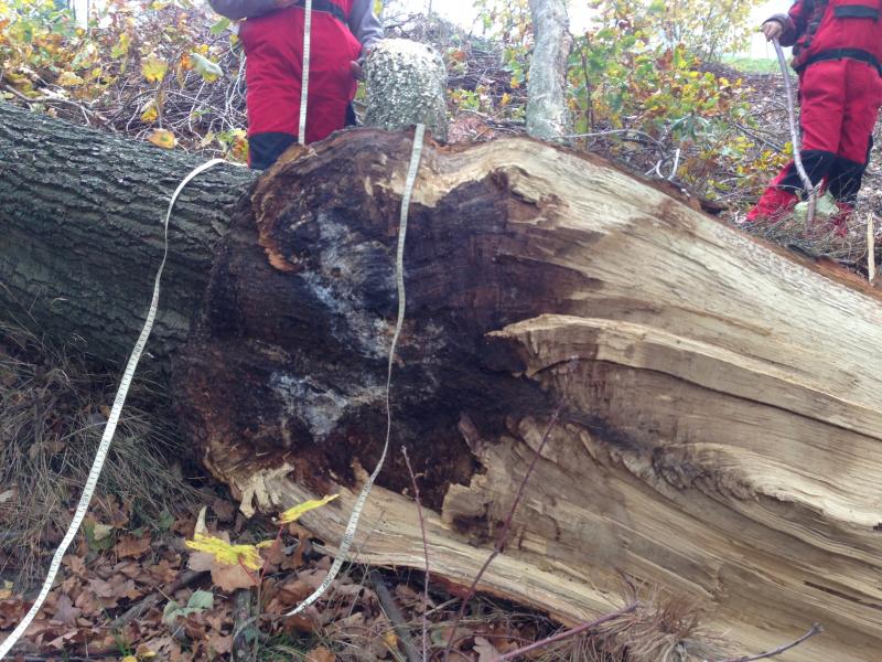 Ich habe am Wochenende noch mal den ausgebrochenen Teil vermessen, er hat an der dicksten Stelle einen Durchmesser von ca. 90 wie man auf Bild 5 erkennen kann ist der abgebrochene Teil schon zu sehr großem Teil morsch gewesen und auch der verbleibende Baum ist an diesem Teilstück morsch. Der Querschnitt des verbleibenden Teils ist arg verjüngt. :(