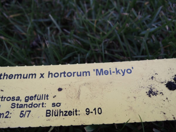 Das würde zu der Beschreibung und dem Foto in der RHS-Enzyklopädie Plants & Flowers von Christopher Brickell passen: Abgeflachte Blumen, 3 cm, dunkles lila-rosa, gelbe Mitte. Doch auch das Foto dort entspricht dem Typ 'Mei-kyo'. Ich meine, wir müssen abwarten - sie sind mir alle zu ähnlich. :-\ Waren noch viele Blütenköpfe an der Pflanze?