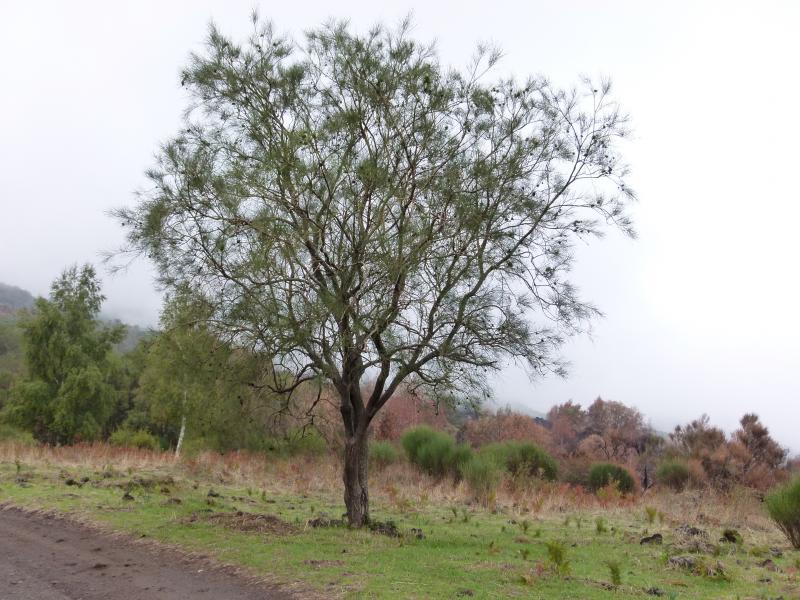 Wieder nicht in Blüte, aber am Wildstandort: der Ätnaginster, ein kleiner Baum oder großer Strauch, bei uns winterhart und im Sommer überschüttet mit gelben Blüten. Beth Chatto setzt mit Genista aetnensis einen markanten Akzent über ihrem Kiesgarten.