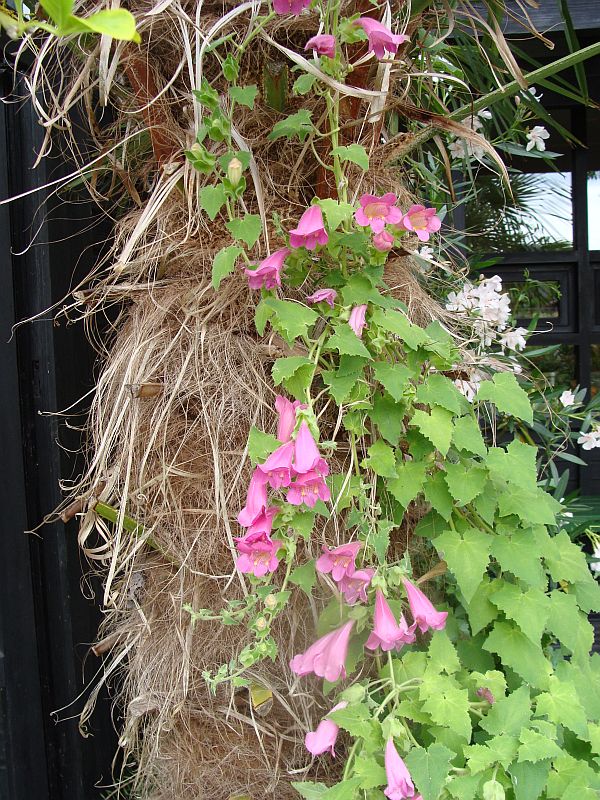Lophospermum erubescens ist meines Wissens kaum bekannt, genau wie die verwandte Asarina scandens. Zu Unrecht. Beide sind zwar nicht winterhart (obwohl Asarina scandens bei mir seit 3 Wintern in einer Terrassenfuge direkt am Haus ausdauert),lassen sich aber leicht aus Samen ziehen und blühen dann von Juli bis zum Frost. Überwinterte Pflanzen blühen schon ab Mai. Sie schaffen eine Höhe von 4m bis Oktober. Diese Pflanze lasse ich in eine Hanfpalme wachsen.