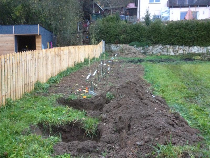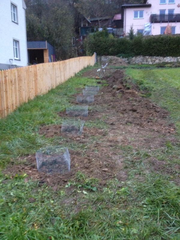 Nachdem ich schon seit längerem die Diskussion über Lubera Äpfel verfolge, habe ich mich entschlossen auch mal einen Versuch zu starten. Also b-hörnchens Ratschläge berücksichtigt ( vielen Dank dafür an dieser Stelle!) und mir den Boden vorgenommen..Minibagger bestellt und Löcher ausgebuddelt..Mist und Kompost eingearbeitet, Drahtkörbe geflochten, Pfostenanker gesetzt..drauf los gepflanzt..sieht jetzt so aus: