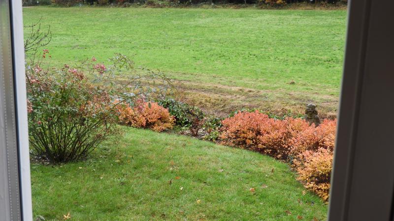 Ein paar Tage später ist die Kupferfelsenbirne komplett gefärbt, Blick aus dem 1.Stock: