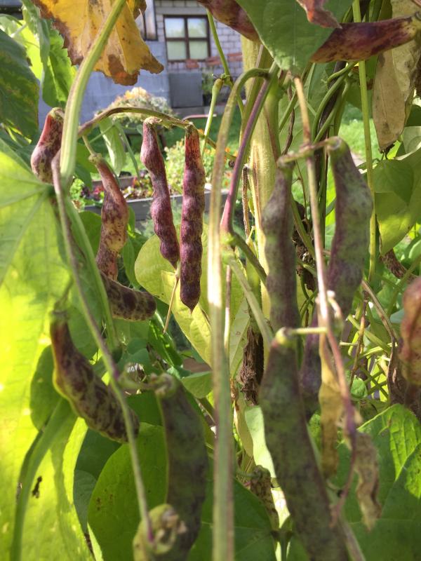 ich habe eine unbekannte Stangenbohnensorte anzubieten, die sich bei mir seit ein paar Jahren mit etwas Hilfe selbst aussät. Ich lasse die Schoten den Winter über an der Pflanze und im Frühjahr kommen sie auf den Boden.