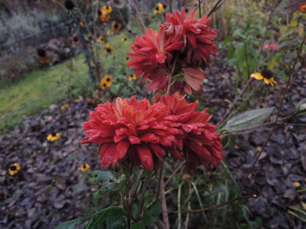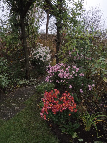Irm, Deine Chrysanthemen sind noch sehr schön. Lass die lümmelnde Umschuld sich doch längs ins Beet legen. Jetzt stört sie doch nichts anderes mehr und gibt ein schönes "Lagebild".