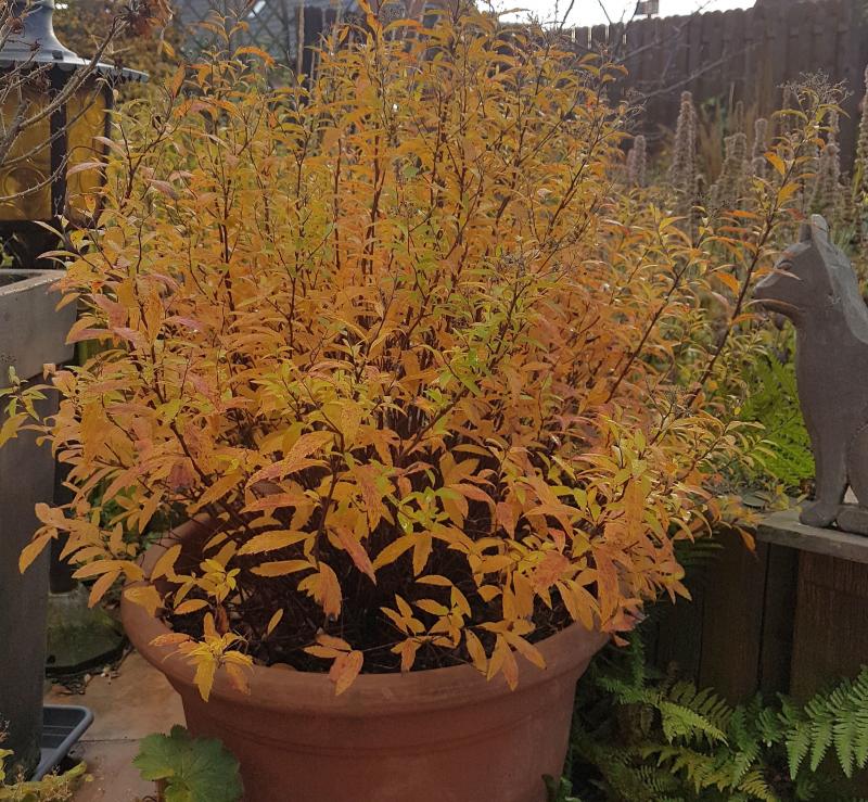Ich habe das Gefühl, der Garten hat immer neue und schönere Zauber parat. Die Parrotia (in der Mitte hinten) färbt jetzt leuchtend orange-rot-gelb. Der panaschierte Miscanthus glänzt auch nochmal in der tiefstehenden Sonne.