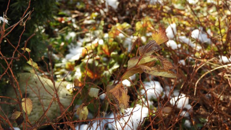 Im Vorgarten sind Herbst, Winter und Frühling gerade bunt gemischt: