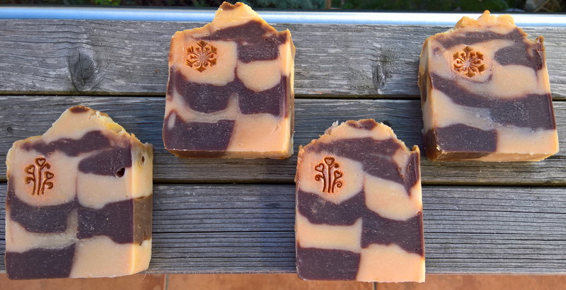 Gestern gab es eine neue Seife. Schwägerin möchte gern Vanille-Schokoduft. Den braunen Teil habe ich mit Kakao gefärbt. Duft sind PÖs von Grapefruit, Vanilla Bean und Dark Chocolate. Ansonsten ist sie aus Palmkernöl, Rizinus, Kakaobutter, Olivenöl und Babassu. Ziegenmilch hat sie auch noch bekommen. Hab die Masse geteilt, zwei Gefäße mit je 50 g Ziegenmilch angewärmt, eins mit Kakao und Dark Chocolate und das andere nur mit Vanilla Bean bestückt und drunter gemischt. Der Versuch eine Art Schwarz-weiß Gebäck hinzubekommen ist mir nicht so wirklich gut geglückt ;-)