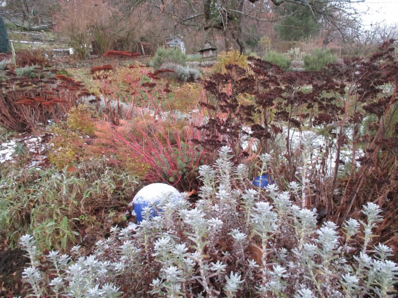 Hier kommen üblicherweise im November große Regenmengen runter - alle die hier genannten Stauden liegen im Winter längst zermatscht am Boden und frieren dann zu großen Platten zusammen, unter denen die Wurzelstöcke faulen. Selbst die fünf hohen Sedum-Arten, die ich hier im Garten habe, haben noch nie bis zum Winteranfang durchgehalten.