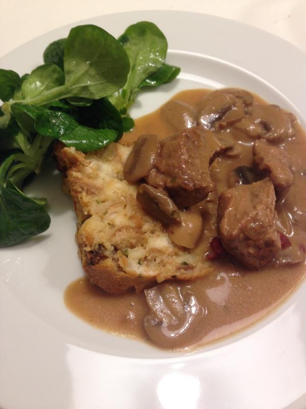 Heute gabs Sonntagsessen. Kalbsrahmgulasch mit Pilzen. Semmelknödel (im Ofen in der Gugelhupfform gemacht) und Ackersalat