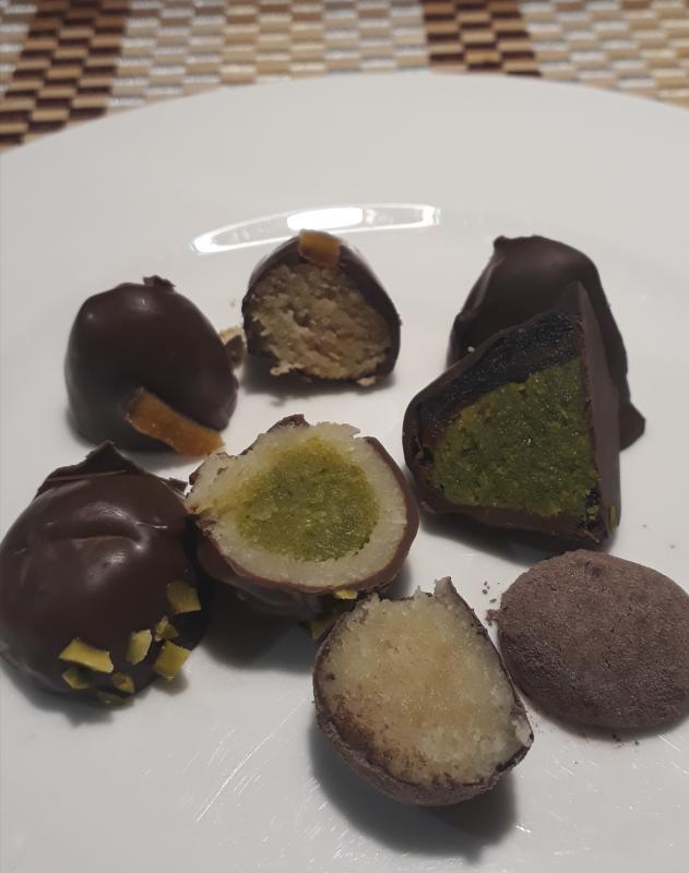 Inzwischen habe ich auch je eine Praline durchgeschnitten und probiert. Am besten schmecken mir eigentlich das IngwerMarzipan und die "panierten" Kugeln. Und es macht sich sehr gut, dass der Zuckeranteil deutlich niedriger ist, als immer angegeben. Dass in dem Pistazienkern recht viel Alkohol ist, schmeckt man erstaunlicherweise kaum heraus ???