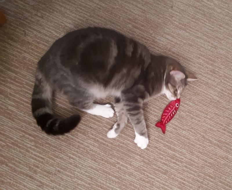 Aber es kam ein Brief von der Katzenweihnachtsfrau mit Geschenken. Sita hat gleich beim Auspacken geholfen und sich eins davon geschnappt. Die Fischli sind mit Katzenminze, einer kleinen Schelle und Knisterzellophan gefüllt. Da wurde erst mal Nase an Nase gekuschelt...