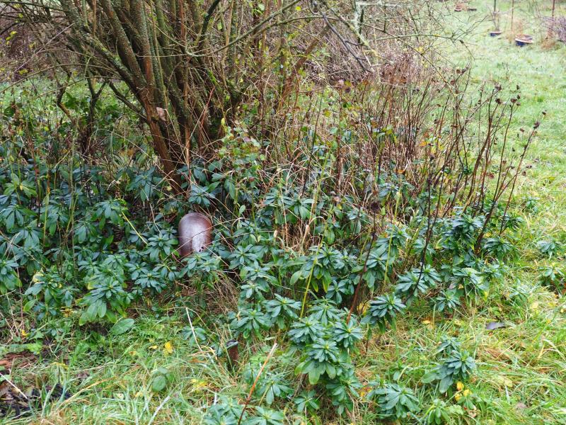 heute ist im Wiesengarten alles grün. Euphorbia robbiae wandert in den Rasen ein.