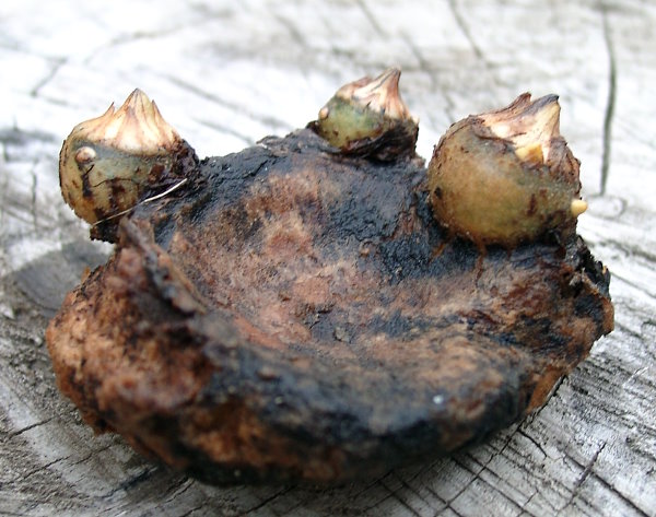 ...nachdem sich dezent die triebspitze zeigte, tat sich nix mehr, während die exemplare im garten alle schon mächtig lange blattstängel geschoben haben. hab die töpfe heute geleert...waren gute knollen mit triebansatz, aber kaum wurzeln. das substrat war sehr warm...denke, das war der grund für den wachstumsstop. die brauchen kühlen boden. habe die knollen sofort in den garten gesetzt. sie hatten keine faulen stellen. 2 waren rekonvaleszenten aus dem vorjahr...ausgeschabte matschknollen. hier ein extrembeispiel...von der knolle war nur eine flache ausgehöhlte scheibe übriggeblieben, reste des holzkohlepuders erkennt man noch...hat sich gelohnt, die nicht gleich in dem müll zu werfen