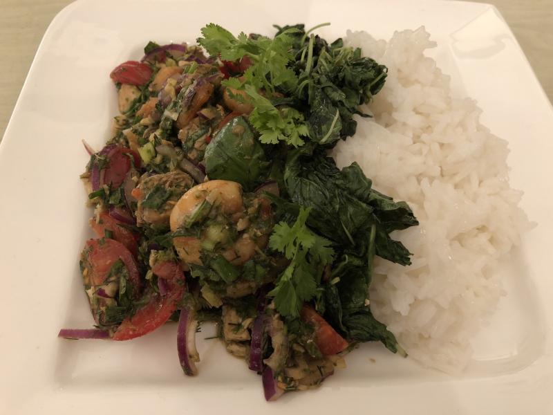 eigentlich wollte ich allameng-thai-glasnudelsalat mit hühnerfleisch, garnelen und fisch machen, aber aufgrund der mengen habe ich die nudelpackung wieder weggelegt. hier eine impression auf halbem weg.