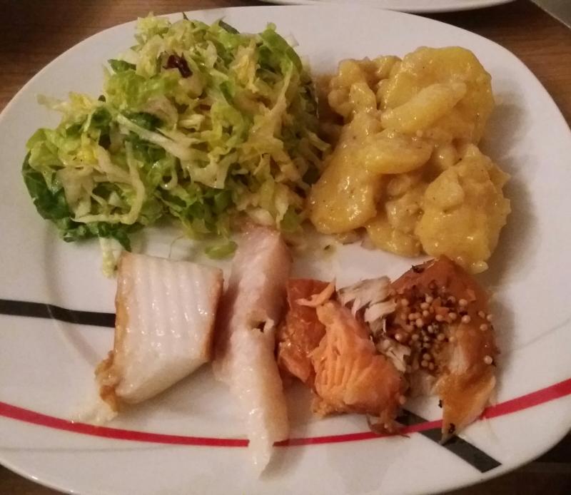 Am Abend dann "Herrentoast": Für jeden in einem Keramikpfännchen 1 große Scheibe Toastbrot, darauf 2-3 vorgebratene Schweinemedaillons, 1 großer brauner Champignon in Scheiben vorgebraten, 3-4 Stangen Spargel aus dem Glas und das ganze mit Gouda überbacken. Dazu gemischtes Bier 1/2 Alt- und 1/2 Malzbier.