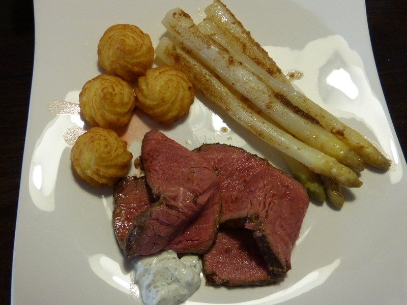 Hier gab es saftig-zartes Roastbeef mit Spargel und Herzoginkartoffeln.
