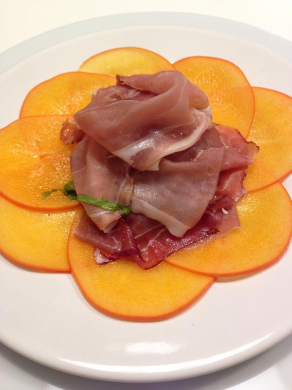 Wir hatten gestern Khaki mit rohem Schinken und Gartensalat (unterm Schinken versteckt)