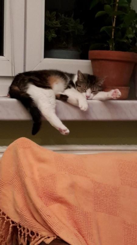 Ich habe mir aus dem Tiefkühlschrank eine Thunfischpizza mit nach oben genommen. Uih, wie die toll gerochen hat und noch besser geschmeckt. Ich rechnete mit Lilli als Mitesserin und was macht die, zieht das Näschen bis zur Stirn hoch (fast jedenfalls) und liegt jetzt immer noch in meinem Bett und hat beide Vorderfüßchen übers Gesicht gelegt.