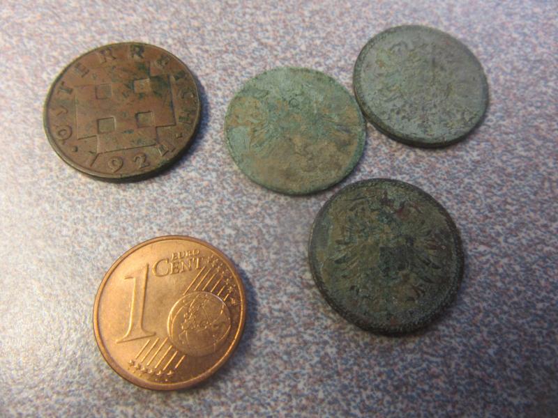 Rechts: drei Groschenmünzen aus dem vorletzten Jahrhundert, irgendwann mal draußen gefunden, hat natürlich Spuren hinterlassen, Patina eben. Würde man wahrscheinlich (?) besser sauber bekommen, ein paar, die im Schrank die Zeiten überdauert haben gibt es aber schon.