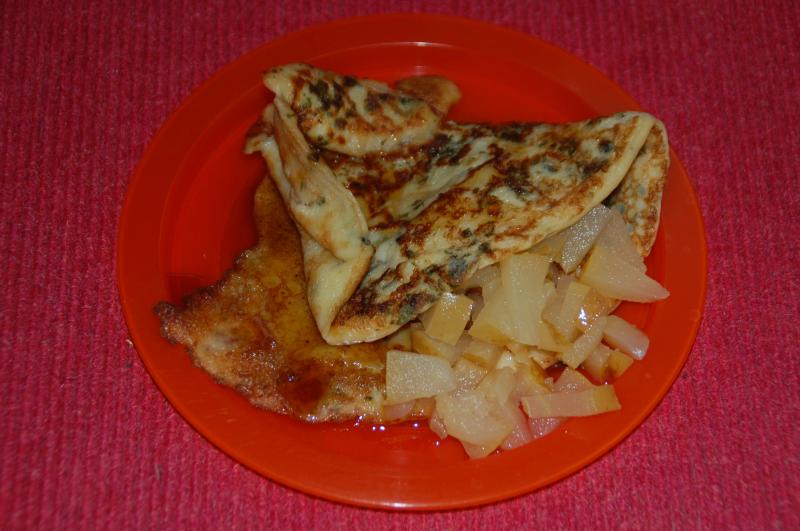 Koriandereierkuchen mit Apfelkompott und Ahornsirup