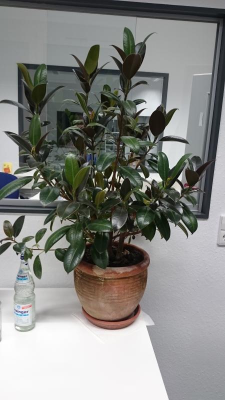 ich habe einen sehr schönen Ficus im Büro zu stehen, er sieht aus wie der typische siebziger-Jahre-Gummibaum, nur in allen Teilen kleiner. Ficus elastica ist es aber wohl nicht, es sei denn, da gibt es kleinere Sorten. Er ist gut gepflegt, schön buschig gewachsen und ziemlich mächtig.