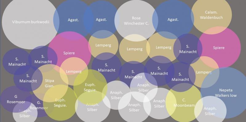 In grober Anlehnung an den Plan, der dir am besten gefällt und am stimmigsten scheint auf's Beet setzen. Und dann einfach noch mal ein bisschen schieben, bis die Optik passt. Machmal hilft das besser als jede Planung... ;)