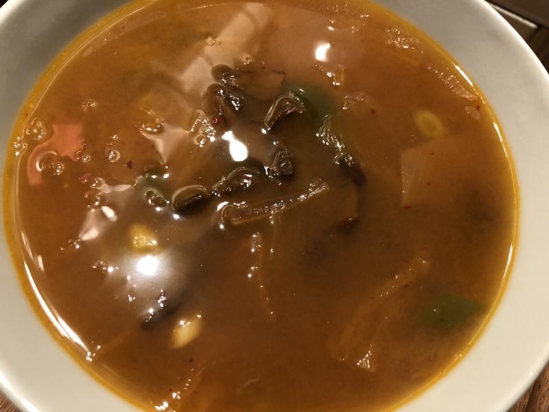 das alte muss platz machen für das neue: kimchi-suppe auf basis von hühnerbrühe mit selbstgefangenen und getrockneten waldpilzen