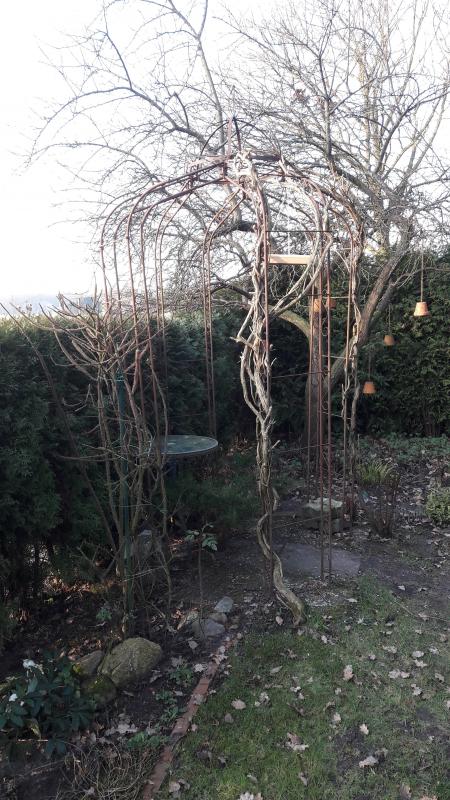 Ich hänge mal ein Bild an. Die Rosen sollen an den vorderen "Ständer" (die Campsis ist tot) und an den freien hinteren Ständer (links), da wäre es erstmal schattig.