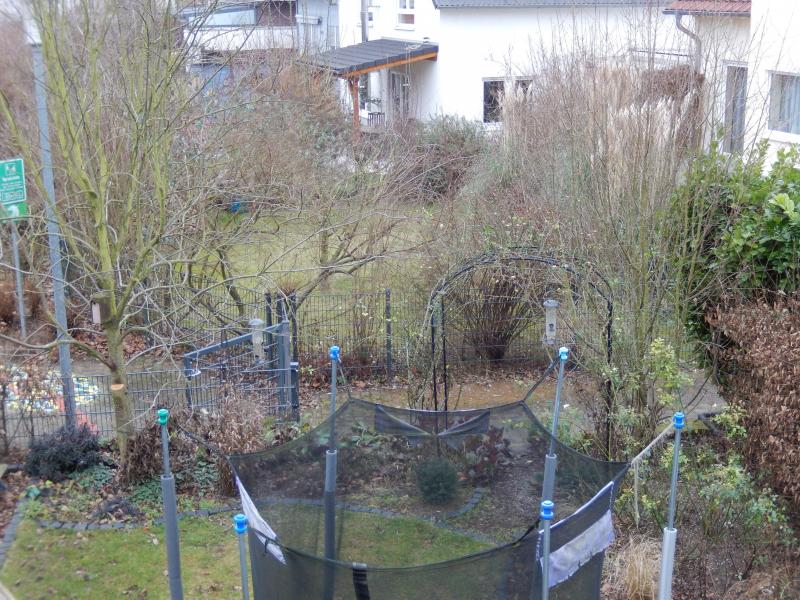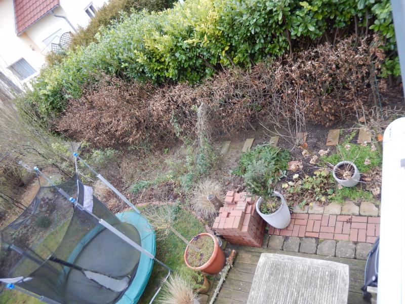Das Trampolin wird weichen, wenn die Kinder keine Lust mehr darauf haben. Dann will ich auch die vordere Beetgrenze noch in die Rasenfläche verschieben. Derzeit ist das Beet an der schmalsten Stelle 2,50 m breit (einschl. Hecke). Die Länge einschl. Obst vorne und Kornelkirsche hinten beträgt 11,50 m.