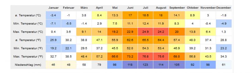 Hier sind einigermaßen passende Klimadaten - aktuell herrscht dort noch tiefster Winter, die Taglilienhochblüte ist hier im Juni, dort ca. 3-4 Wochen später. Der See in der Nähe sorgt für etwas milderes Klima als in der Region üblich - Kamelien überleben und blühen dort ausgepflanzt an geschützten Plätzen (mit Winterschutz).