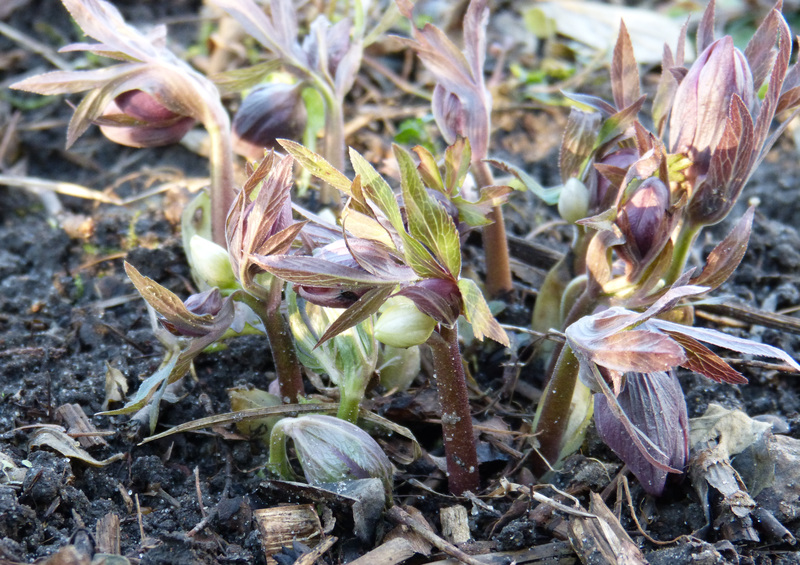 Helleborus purpurascens fängt an zu blühen. Was mich dieses Jahr irritiert, sind die hellen Knospen dazwischen. Was das wohl wird? ???