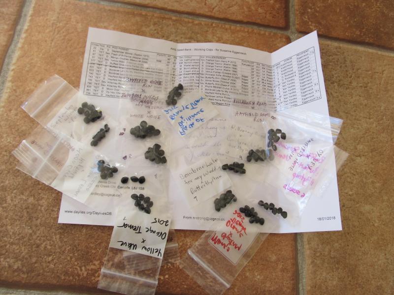 Jedes Jahr schickt die AHS eine lange Liste mit Crossen aus, die von Mitgliedern gespendet wurden - man darf nach Herzenslust wählen und nicht mal das Porto ist zu ersetzen. Viele der Elternsorten sind in Europa nicht erhältlich - seit der Importsperre stellt diese Aktion eine noch bessere Quelle für jeden dar, der sich gerne züchterisch betätigt.