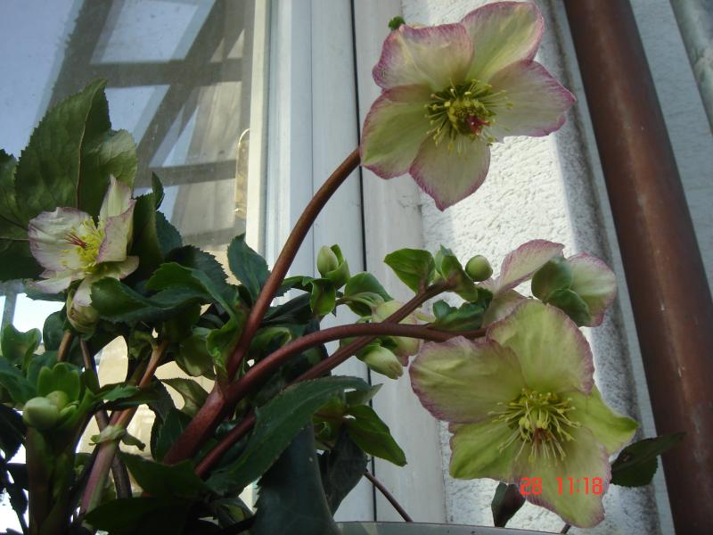 Helleborus X glandorferi Ice N Roses, im Topf und hochgestellt