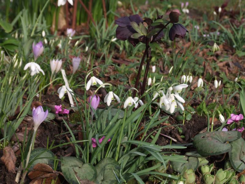 Winterlinge, Cyclamen und Schneeglückchen, Hamamelis, Winterschneeball, Haselnuss und viele, viele Spitzen von Narzissen und Tulpen. Habe heute früh mal in Ruhe geschaut - der Frühling in jeder Ecke - Auweia, und das Anfang Februar, das dicke Ende kommt sicher erst noch...