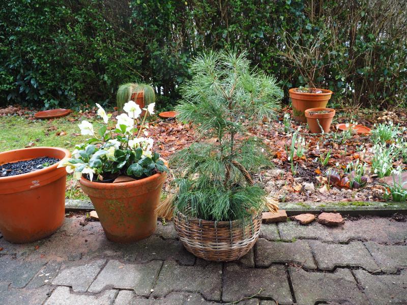 Weihnachten 2017 hatten wir wieder eine Kiefer für den Kübel. Pinus strobus. Die steht jetzt so, wie wir die drinnen hatten mit ihrem Körbchen draußen. Neben Christrosen.