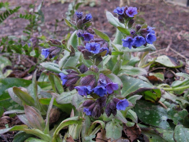 Hier blüht seit Jahren zuverlässig früh diese Pulmonaria. Es ist ein Sämling mit großen Blüten und Laub, der hinten im Garten eigentlich zu den "Perlen vor die Säue" gehört. Nach der Blüte wird geteilt und es werden endlich Plätze im Vorgarten gesucht.