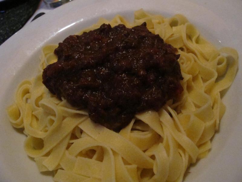 Hier sollten ein par Stücke Ochsenschlepp aus dem Tiefkühlfach (hatte ich beim Landfleischhauer in Gedanken an borragine gekauft - wo steckt sie eigentlich?), also wurde gestern stundenlang im Ofen geschmort, mit viel Rotwein, Wurzeln und Gewürzen, und heute kleingeschnitten. Sehr geschmacksintensiv, perfekt zur Pasta. Dazu Vogerlradicciochicoreesalat.