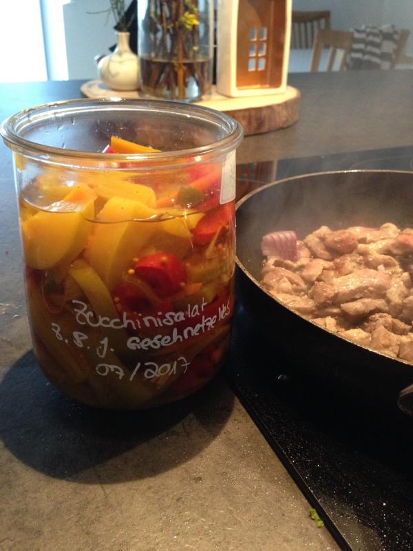 Heute hab ich das erste von zwei Gläsern eingekochtem "zucchinisalat" verarbeitet. Ich glaube das Rezept war von bienchen? JedenfAlle wurde zusammen mit schweinefleisch und Ananas ein chinesisch süß sauer daraus. Lecker!