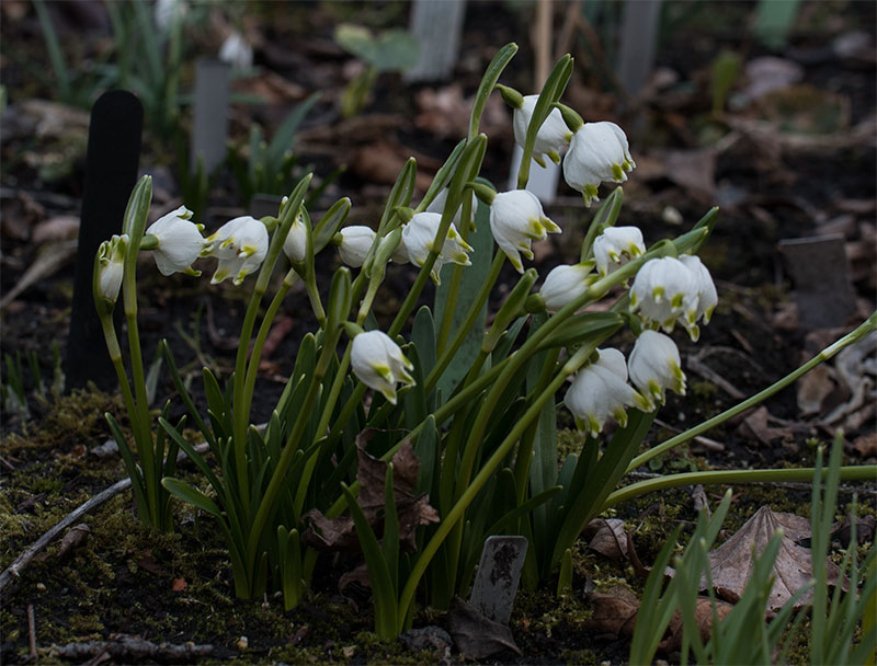 Die Leucojum sehen hier passabel aus, bei einigen mit wie festsitzenden, bodennahen Blüten.