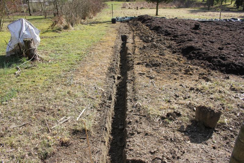 Und hier mal unser "Unkrautgraben" aus der Nähe. Er wird mit Kompost gefüllt, damit von außen einwachsende Wurzelkräuter leicht entfernt werden können. Ob es wirkt? Wir werden sehen: