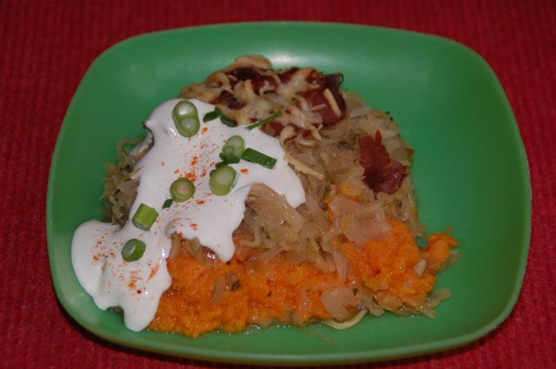 [URL=http://www.lecker.de/deftige-suesskartoffelromanze-mit-sauerkraut-72807.html]Süßkartoffel-Sauerkraut-Auflauf[/url] (Süßkartoffeln, Sauerkraut, Zwiebel, Schwarzwälder Schinken, Petersilie, Äpfel, Apfelsaft, S&P, Muskat, Butter, Gouda) mit Dip (Schmand, Paprikapulver, S&P, Milch, Lauchzwiebel)