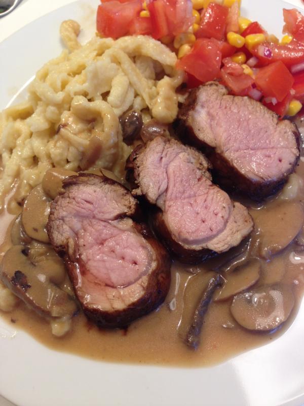 Gestern gabs Schweinefilet mit Pilzen, Spätzle und Salat