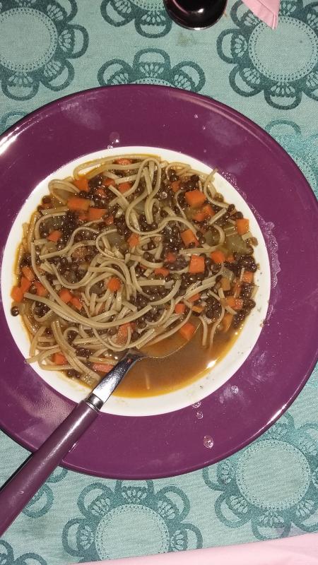 Am Montag gab es Linsensuppe mit Möhre, Sellerie und Suppennudeln.