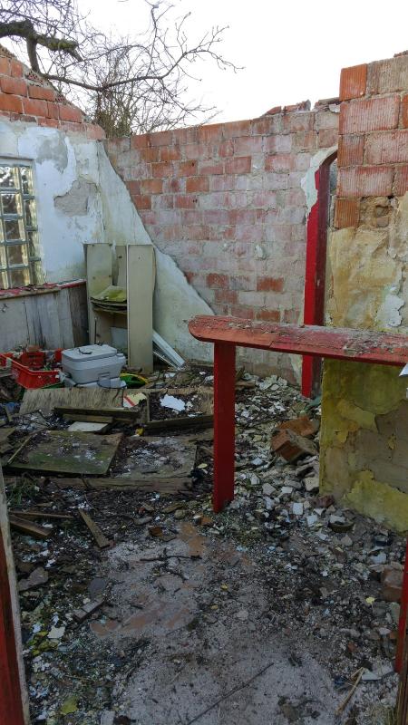 Plastikmüll u.a. Zeugs habe ich schon gesammelt und entsorgt, stapelweise Altholz und Paletten getürmt.In der ruinösen Hütte wartet eine 10cm Schicht Zementbrocken und Müll und Fliesensplitter auf Entsorgung.