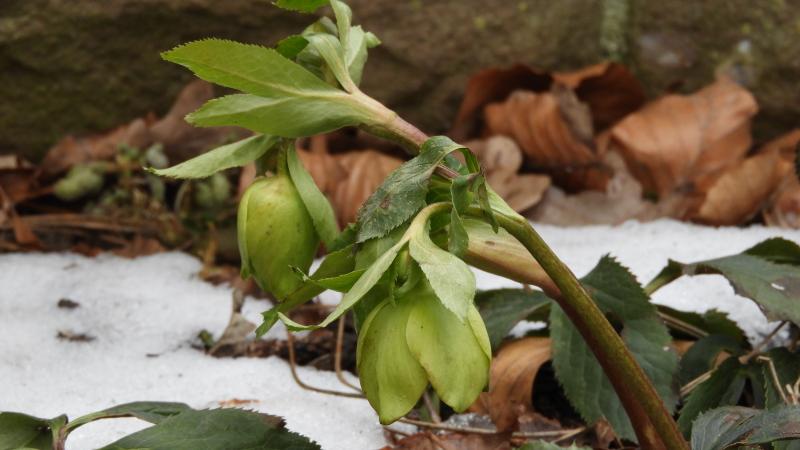 Die meisten Helleborus hier sehen recht gut aus. Auch die voll aufgeblühten Exemplare haben ihre Blütenstiele wieder aufgerichtet, bei ein paar wenigen sind die Blütenstiele auf halber Höhe geschädigt und abgeknickt.