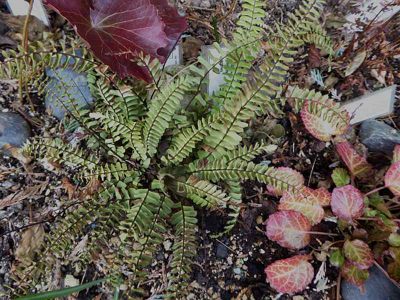 Auf das Herz des im Frühjahr ausgepflanzten Woowardia unigemmata hatte ich Laub gepackt, das war aber leider nicht mehr vollständig dort geblieben, ob die sichtbaren Triebknospen noch leben, weiß ich nicht. Ich hatte aber nur einen Teil ausgepflanzt, den Rest habe ich vor dem strengen Frost in ein weitgehend frostfreies, aber dunkles Quartier gerettet. Beide sehen nicht schlecht aus, auch der Ausgepflanzte ist ordentlich grün, aber besagt das etwas?