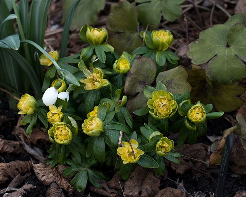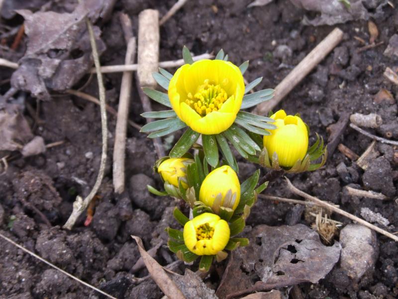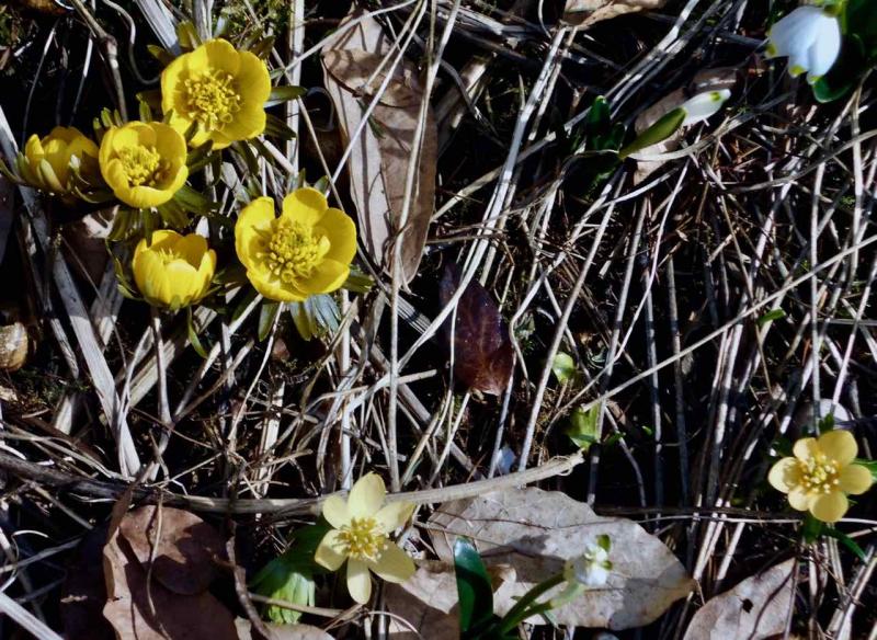 Eranthis ´Sachsengold´hatte mir schon Sorgen gemacht, weil es nicht austrieb. Es ist in meinem Garten mit Abstand der späteste Klon, kommt aber nach einem Jahr schon mit erfreulichen 5 Blüten.
